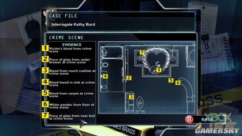 命案现场会搜集到4个血液样本,分别是尸体上、沙发坐垫背面、厕所的洗手槽里、房间右侧小吧台与床中间的地板上。另外在小吧台底部有白色粉末。心型烟灰缸的碎片在厕所与门外柜子间的地上,另一块是必须开动电动床才会掉出来,位置是在床与粉红色台灯之间,这块碎片必须在离开命案现场再回来、尸体已经移走后,才会出现。