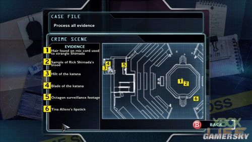 这次的命案现场同样也得要来两次才能搜集完全部迹证。第一次来时只能采到被害人Rick Shimada旁边麦克风线上的头发(迹证1)及被害人的血(迹证2);第二次来,利用从联盟所有人Horace Willingham拿到的钥匙打开二楼的门,在左边的小房间里可以拿到断成两截的武士刀(迹证3、4)及放在机器里的录影带(迹证5),另外,在第一次询问Tina Allens的地方,还可以找到她遗留的口红。