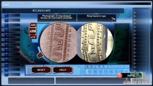 命案现场拿回的迹证1,要跟在验尸时拍到的照片比对。用显微镜比对时,为了避免被扣分,不应该让你的搭档说出「这里没什么(有趣的东西)」这样的话,也就是说,在还没调准焦距时,先凭着模糊的影像约略把物件放到画面中间,此时再去调焦距,只要影像清楚,就可以一次Match到。而戒指与照片在显微镜下的长相大致如下图。