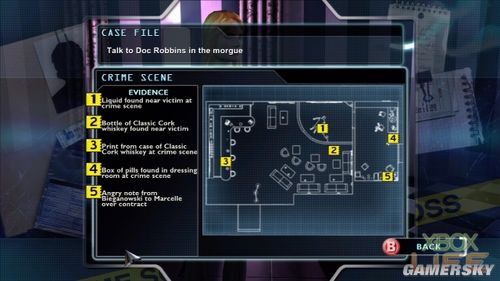 在钢管俱乐部的椅子上有四枚指纹要采。之后顺着剧情再回来时,要注意吧台上的白色餐巾纸,要在上面采集DNA。餐巾纸是个很好的范例,告诉我们并不是找到证物就可以,还要把它叫出来,再上面采迹证。