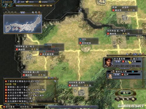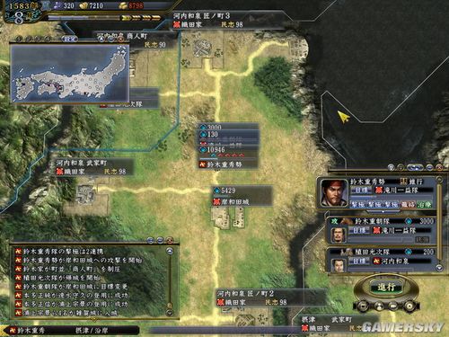 1.开局思路,压制筒井,由于铃木的2个商业町都在城的前面,属于朝夕不保的町,而铃木人才多,还要生产铁炮,因此钱是第一位的.所以抢占筒井的町是王道.把防线和筒井前线推到第2条河边.这样能围下3町.至于为什么不围大和,很简单,围下来了,多了3条战线,不如拿町实在.