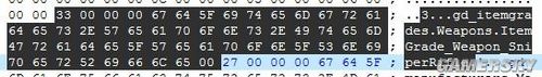 其中部件部分的字节为有含义的ascii字符串,如果我们修改了这个,武器的组成部件就会换成我们修改的部件,同时上述的hex_A字段也需要重算和改写,不然整个存盘文件的偏移就会算错。