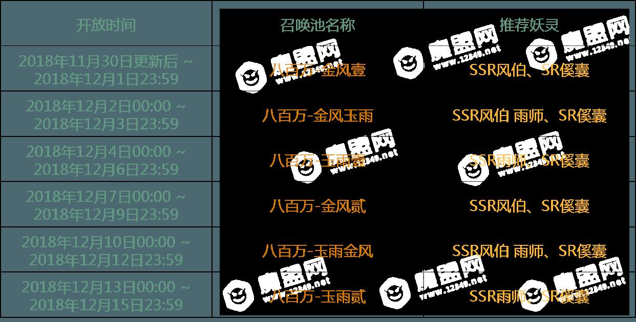 本次活动卡池中,共有六个活动召唤池「八百万 · 金风壹」「八百万 · 金风贰」「八百万 · 玉雨壹」「八百万 · 玉雨贰」「八百万 · 金风玉雨」「八百万 · 玉雨金风」,六个召唤池会交替开放,以供大人召唤妖灵