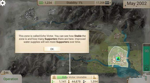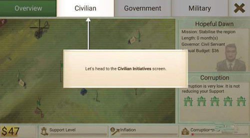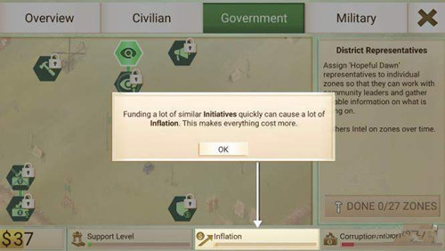 右上角的叉点了可以回主地图。主地图上,右下角的锤子展示了你的团队正在努力推行你的举措。