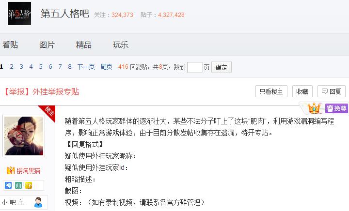 搜索“第五人格外挂举报专贴”,点击进入以后,将自己要举报的玩家按照以下模式提供信息即可:
