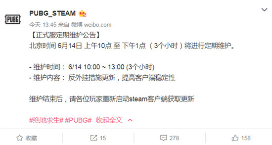 绝地求生6月14日预计在上午10点停服维护,维护3个小时,结束维护之后开服。这次停机更新,主要是更新反外挂措施。